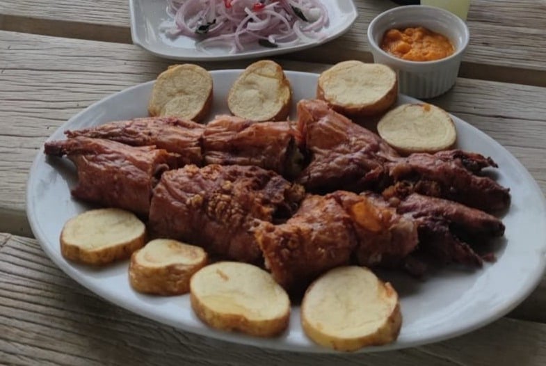 PAN, MANTEQUILLA, ANTICUCHO HIGADO DE POLLO, CUY ENTERO A LA BRASA , PAPAS, ENSALADA Y SALSAS